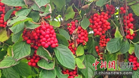 秋日里,安圖縣亮兵鎮(zhèn)會(huì)財(cái)村色彩斑斕,一株株藤蔓沿著水泥樁蜿蜒攀升,一排排連成一片,遠(yuǎn)遠(yuǎn)望去,如同為田野織就了一層綠綢;綴滿其間的五味子,則是這綢面上最亮眼的“紅寶石”。