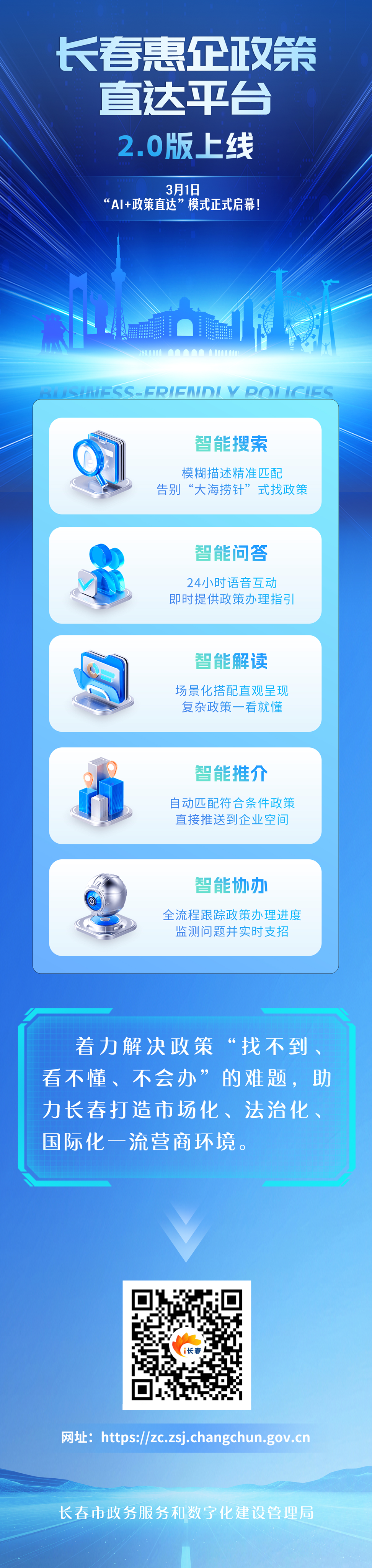 長春市政數(shù)局營商環(huán)境服務(wù)處二級(jí)調(diào)研員傅強(qiáng)介紹,2021年,長春惠企政策直達(dá)平臺(tái)1.0版上線。經(jīng)過五年實(shí)踐打磨完成全面升級(jí),2.0版主打大數(shù)據(jù)+人工智能技術(shù),從企業(yè)視角打造AI應(yīng)用場(chǎng)景,讓企業(yè)輕松找政策、方便辦政策。