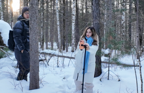 深入雪谷腹地,采風(fēng)團(tuán)一行涉入尚未冰封的溪水,手扶古木,沿溪而行。“這種體驗(yàn)太美好了,在滿是積雪的森林深處行進(jìn),感覺太奇妙了。”美國網(wǎng)絡(luò)博主于中美驚嘆道。