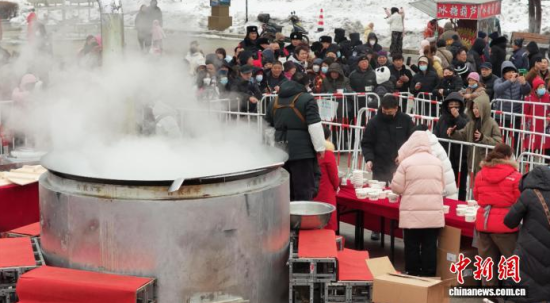 中新網(wǎng)吉林2月5日電 (記者 石洪宇)在廣場(chǎng)上架起直徑2米的大鐵鍋,柴火在灶里噼啪作響。廚師揭開鍋蓋,熱氣蒸騰,年豬燴菜的濃香四散飄溢。