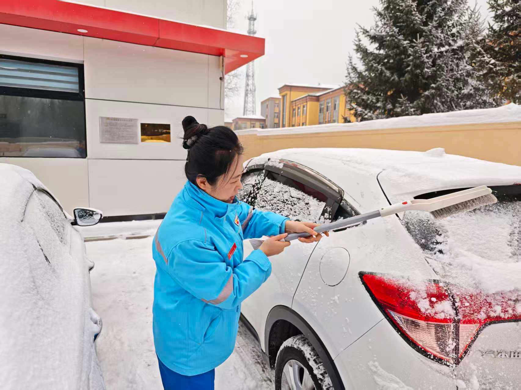 白山分公司三岔子站員工化身“清雪衛(wèi)士”,手持清雪工具,為每一輛進站車輛仔細清掃擋風玻璃與車燈上的積雪冰霜,保障行車視線清晰!把┨扉_車最怕視線不清,你們幫忙清理干凈,心里一下子就踏實了!彼緳C王師傅由衷地感謝。