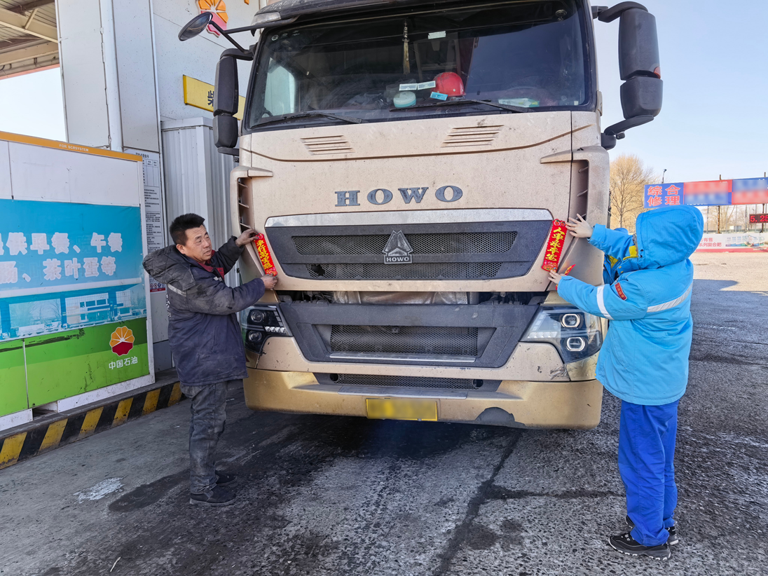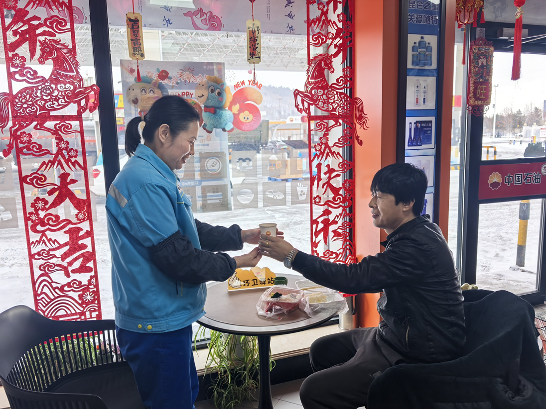 吉林市分公司磐石煙筒山站內(nèi),紅燈籠錯落懸掛,節(jié)日商品琳瑯滿目,休息區(qū)姜茶暖香四溢!皫煾,您跑長途返鄉(xiāng),胎壓有點偏低,需要幫忙調(diào)整嗎?”加油員一邊加油,一邊細心提醒,細致服務贏得司機連連道謝。