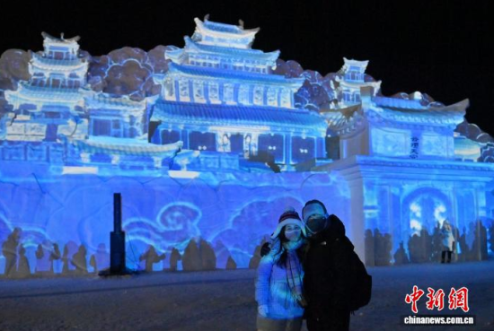 12月26日晚,吉林長白山,新落成的高30米、寬70米、用雪量10萬立方米的雪雕版“云頂天宮”正式點亮。這座以探險題材小說《盜墓筆記》為藍本雕琢的冰雪地標(biāo)廣受書迷關(guān)注。中新社記者 張瑤 攝