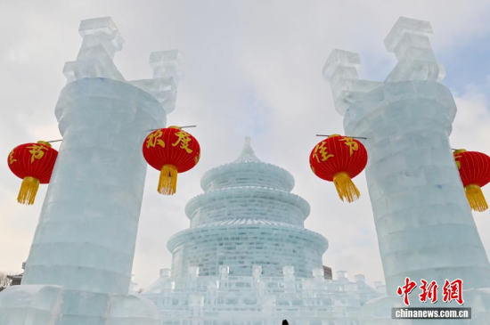 1月12日,在長春市的文化廣場上,一座以北京天壇祈年殿為原型的巨型冰雕成為冬日一景。冰雕高約21米,用冰量5010立方米,飛檐、殿頂?shù)葌鹘y(tǒng)建筑細節(jié)均被精準復(fù)刻,陽光下晶瑩剔透,配合紅燈籠冰柱點綴,盡顯中式浪漫韻味,吸引眾多游客前來拍照打卡。中新社記者 張瑤 攝