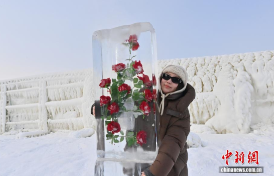 1月13日,在長春云瑯冰雪公園內,一組別具匠心的玫瑰冰雪景觀吸引了眾多游客。中新社記者 張瑤 攝