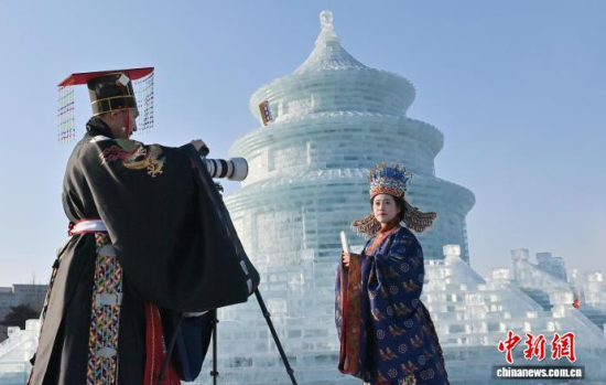1月24日,長春市文化廣場上,眾多漢服愛好者齊聚巨型冰雕“祈年殿”前拍照留念。該冰雕以北京天壇為原型,通體晶瑩,飛檐斗拱皆現(xiàn)冰雪之韻。衣袂飄飄的漢服身影與剔透冰雕相映成趣。中新社記者 張瑤 攝