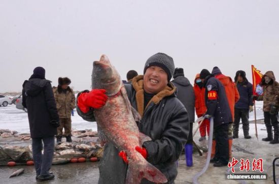 1月6日,吉林鎮(zhèn)賚,游客在哈爾淖水庫展示新捕撈上來的大魚。王凱 攝