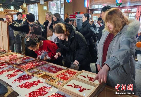 3月8日,吉林安圖,俄羅斯游客觀看剪紙作品。趙健慧 攝